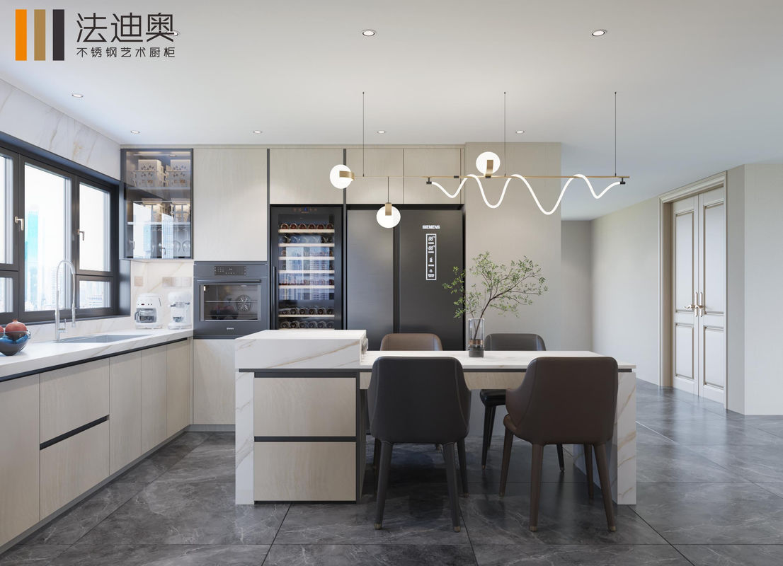 이 커스텀 부엌 캐비닛은 차별화된 마무리 전략을 기반으로 만들어졌습니다. 목재 곡물과 스테인리스 스틸 캐비닛 구조가 결합되었습니다.이 조합은 스테인레스 스틸 캐비닛에서 기대되는 청소성과 프로젝트 내구성을 잃지 않고 구매자에게 더 따뜻한 고급스러운 표현을 제공합니다..