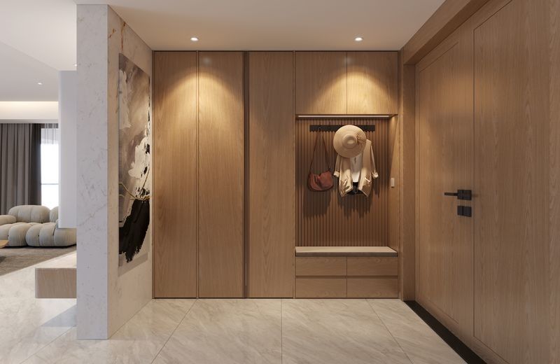 | 벽 패널 | 걸이 공간 뒤에 있는 우드 그레인 격자 벽 패널로, 세련되고 질감 있는 디자인 요소를 더합니다. |
