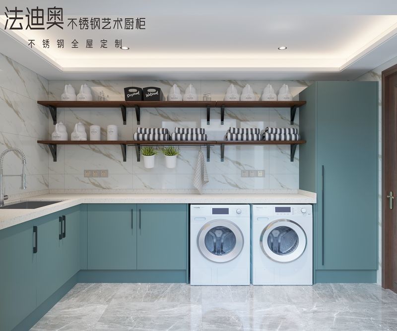 이 세탁실 캐비닛은 일반적인 SKU가 아닌 디자인 주도 시스템으로 제시됩니다. 틸 매트와 스테인리스 스틸 캐비닛 구조를 함께 사용하여 프리미엄 주거 프로젝트를 위한 더욱 완성도 높은 시각적 아이덴티티를 만듭니다.