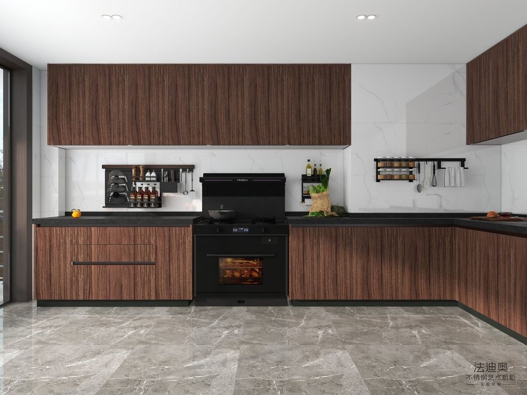 이 커스텀 부엌 캐비닛은 차별화된 마무리 전략을 기반으로 만들어졌습니다. 목재 곡물 / 검은색과 스테인리스 스틸 캐비닛 구조가 결합되었습니다.이 조합은 스테인레스 스틸 캐비닛에서 기대되는 청소성과 프로젝트 내구성을 잃지 않고 구매자에게 더 따뜻한 고급스러운 표현을 제공합니다..