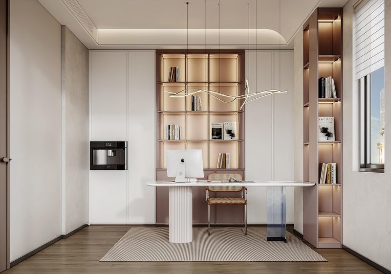 | 세련된 디스플레이와 실용성을 위한 내장 LED 조명이 있는 개방형 선반 옷장과 책상 공간의 매끄러운 전환으로 작업 공간 효율성 최적화 수납 및 기능성 | 밀폐형 수납과 개방형 디스플레이 선반의 조합 |