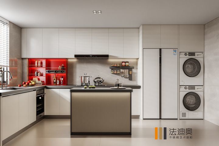 이 부엌 캐비닛은 일반적인 SKU보다는 디자인 중심의 시스템으로 제시됩니다.그것은 프리미엄 주거 프로젝트에 더 해결 된 시각적 정체성을 만들기 위해 스테인리스 스틸 캐비닛 구조와 함께 흰색을 사용합니다.