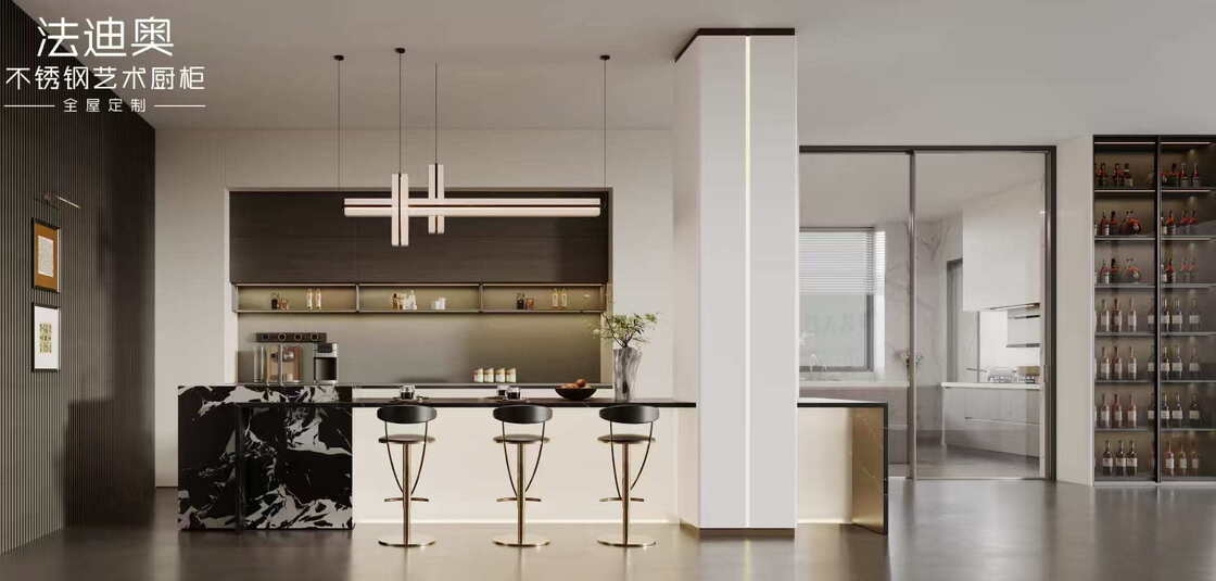 이 부엌 캐비닛은 일반적인 SKU보다는 디자인 중심의 시스템으로 제시됩니다.그것은 프리미엄 주거 프로젝트에 더 해결 된 시각적 정체성을 만들기 위해 스테인리스 스틸 캐비닛 구조와 함께 흰색을 사용합니다.