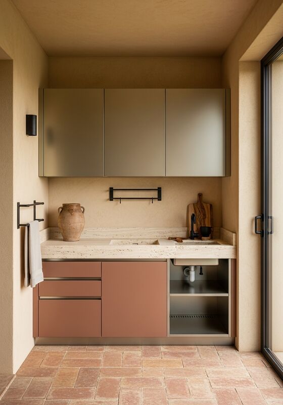 | Design HighlightsMediterranean warm contemporary with artisanal handcrafted character direction with warm champagne-gold metallic structure; terracotta red-brown accent panels; honey-cream travertine with ochre veining; dark iron black hardware accents, disciplined proportions, and pvd-coated 304 stainless steel frame in warm champagne-gold satin finish with integrated waterproof structure. The page should read as a resolved specification, not a generic storage box. |