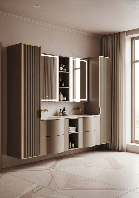 Explore More Related SystemsSee how Taupe Fluted Vanity with Champagne Gold Accents in 304 Stainless Steel connects with neighboring Fadior systems for a more complete bathroom vanity cabinet or whole-home specification. The first link acts as a category gateway; the remaining links are adjacent systems.