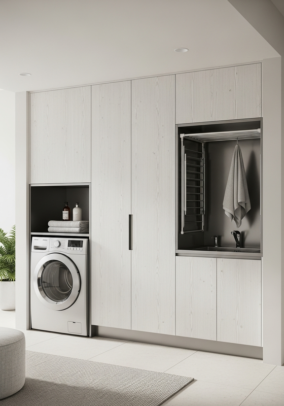 | Q: What cabinet depth is usually recommended for a laundry room cabinet? Recommended depth depends on the room type, circulation width, appliance adjacency, and storage brief. In most premium projects, depth is decided during layout review rather than copied from a catalog, because a better-fitting module plan improves both appearance and daily usability. |