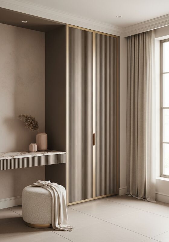 | 디자인 하이라이트부드러운 여성스러운 미니멀리즘과 장인적인 질감 — 수직 플루팅은 따뜻한 머쉬룸 토프가 지배적이고, 연한 샴페인 커튼과 호환되는 톤, 부드러운 로즈 마블 액센트, 샴페인 골드 메탈 디테일, 절제된 비례, 그리고 15mm 피치의 수직 마이크로 플루트 패널 도어가 부드러운 그림자 리듬을 만들어 시각적 소음 방향 없이 미묘한 입체감을 더합니다. 이 페이지는 일반적인 수납 상자가 아닌, 완성된 사양으로 읽혀야 합니다. |